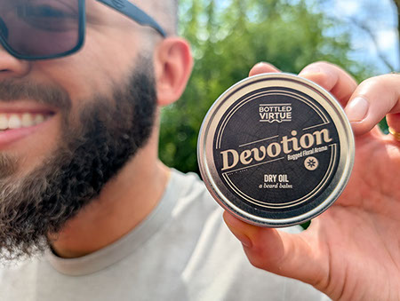 Our balm (aka Dry Oil) melts in your palm and deeply conditions beard and skin. Reduces itch, flaking, and dryness while beeswax helps shape and tame your beard.